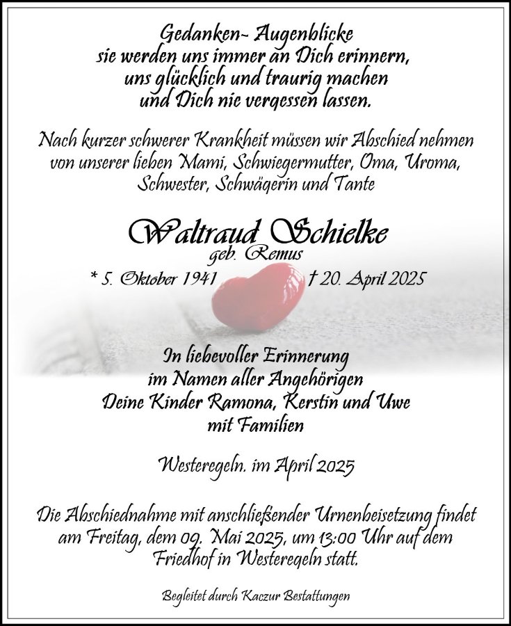 in dieser Zeit des Schmerzes wünschen wir Ihnen Kraft, den Verlust im Kreise Ihrer Liebsten zu verarbeiten. Als Zeichen unserer Anteilnahme und des Gedenkens entzünden wir dieses erste Licht. Möge diese Gedenkseite Ihnen helfen, Erinnerungen zu teilen und so das Andenken gemeinsam wachzuhalten.